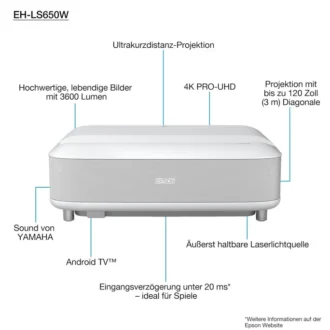 Ursprünglicher Preis war: 1099,00 €824,25 €Aktueller Preis ist: 824,25 €.Sparen Sie 274,75 €Epson EH-LS650W 3LCD Ultrakurzdist. Pojektor 3600 Lumen 4K PRO-UHD HDMI Weiß