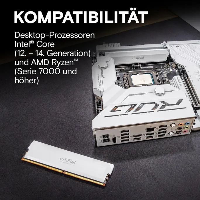 Crucial Pro Overclocking 32GB Kit (16GBx2) DDR5-6400 UDIMM WeißCrucial DDR5 Pro Speicher verfügt über eine beeindruckende Geschwindigkeit und enorme Bandbreite, wie sie zur Unterstützung von Multi-Core-CPUs der nächsten Generation erforderlich sind. Darüber hinaus entfällt der Zwang, sich mit Übertakten, Latenzoptimierung, der Jagd nach Dies und LEDs auseinandersetzen zu müssen.DDR5 Pro Speicher zum ÜbertaktenBringen Sie die Leistung auf die nächste Stufe mit der enormen Geschwindigkeit und Bandbreite von Crucial® DDR5 Pro Speicher: Overclocking Edition. Mobilisieren Sie die Leistung niedriger Latenz, um noch schneller zu werden und den nächsten Sieg zu sichern, anstatt sich über Leistungsengpässe zu ärgern. Unser leistungsstarker DDR5 Pro Speicher zum Übertakten unterstützt Multi-Core-CPUs der nächsten Generation sowie Intel® XMP 3.0 und AMD EXPO™1 auf jedem Modul.Cooles Look-and-FeelUnser DDR5 Pro Speicher zum Übertakten verfügt über einen Kühlkörper und sein Design ist an die Origami-Kunst angelehnt – für eine coole Haptik und einen ästhetischen Gewinn für jeden Rig.Beschleunigte LeistungNiedrigere LatenzHöhere Bildraten pro SekundeReibungsloseres GamingIdeal für AAA-Spiele.Kompatibilität