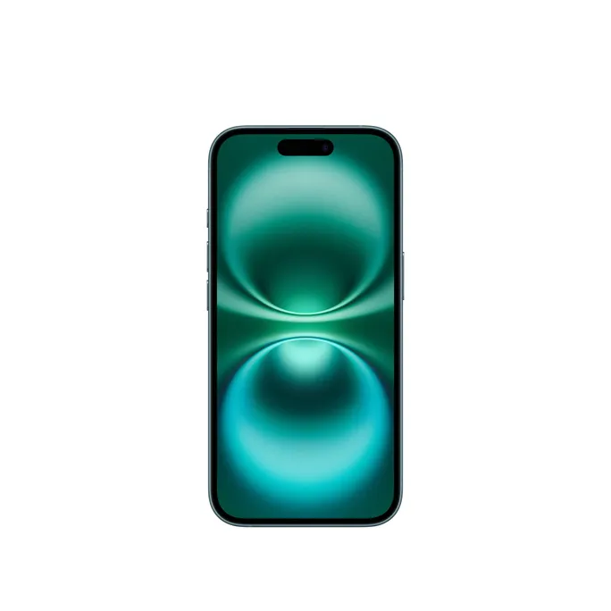iPhone 16 Plus und iPhone 16, Actiontaste, Lautstärketasten, Seitentaste und Kamerasteuerung, Vorderseite, All‑Screen Design, Dynamic Island oben in der Mitte, Rückseite, Blaugrün, erhöhtes, fortschrittliches Zwei-Kamera-System oben links, Apple Logo in der Mitte