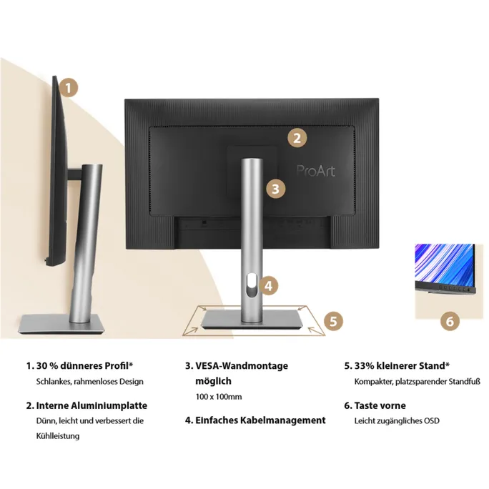 Im Vergleich zu seinem Vorgänger hat das ProArt Display PA279CRV einen um 33 % kleineren Standfuß und ein um 30 % schlankeres Profil, das an seiner dünnsten Stelle nur 8 mm misst. Wie seine Zeitgenossen aus der ProArt Display-Familie ist auch der PA279CRV in einem Studio oder in jedem Wohnbereich zu Hause. Seine schlichte Eleganz ist eine Verbeugung vor exquisiter Handwerkskunst und kompromissloser Liebe zum Detail.