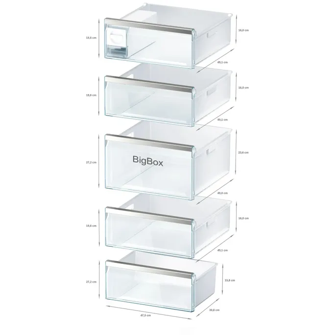 Eine extratiefe Gefriergutschublade zum praktischen Stapeln von Gefrierbehältern oder großen Tiefkühlpackungen, wie Torten oder Pizzen. Ganz egal, ob du einen Kindergeburtstag vorbereitest oder eine Hochzeitstorte lagern möchtest – in der Big Box ist selbst für große Tiefkühlware genügend Platz.