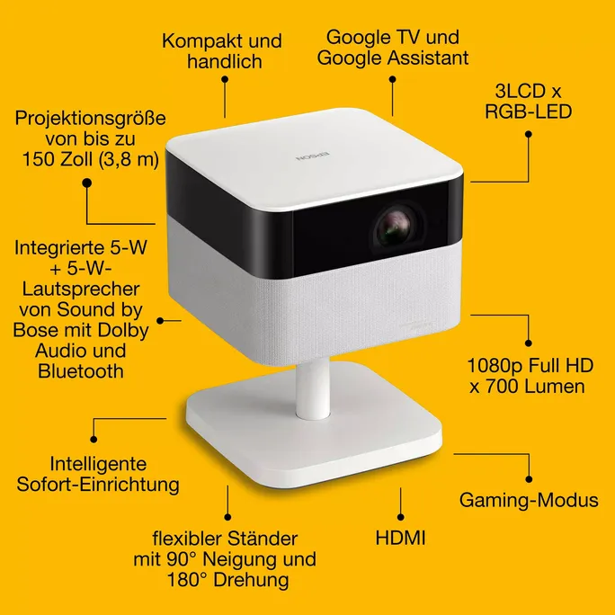 Genießen Sie mit den tragbaren Smart-Projektoren von Epson Lifestudio immersive Momente. Elegant, kompakt und mit zahlreichen Funktionen ausgestattet. Sie verfügen über fortschrittliche, hochmoderne Bild- und Audiotechnologie, integrierte Smart-TV-Funktionen und eine mühelose Einrichtung für reibungslose Unterhaltung im Innen- und Außenbereich.