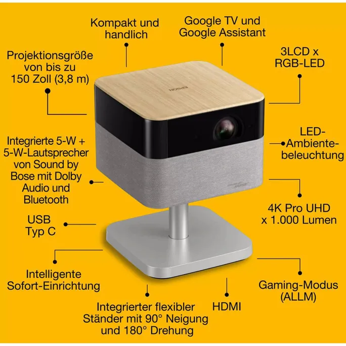 Sofort-Einrichtung Nahtloser Einsatz im Innen- und Außenbereich mit automatischer Einrichtung für einfache Mobilität. Ein verstellbarer Standfuß mit 180° Drehung und 90° Neigung ermöglicht die Projektion auf jede Oberfläche, zu Hause oder unterwegs.