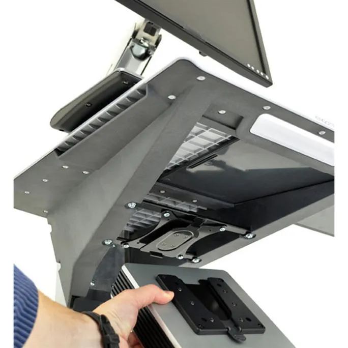 • Die Unterseite der Arbeitsfläche dient zur Befestigung einer Thin-Client-CPU mit einer VESA-konformen Montageplatte.