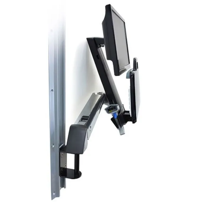 Includes Combo Arm, wall mount bracket, track mount bracket kit, height-adjustable LCD mount, wrist rest, scanner and mouse holder, integrated keyboard tray with left/right mouse tray, handle, VESA monitor mounting kit, cable ties