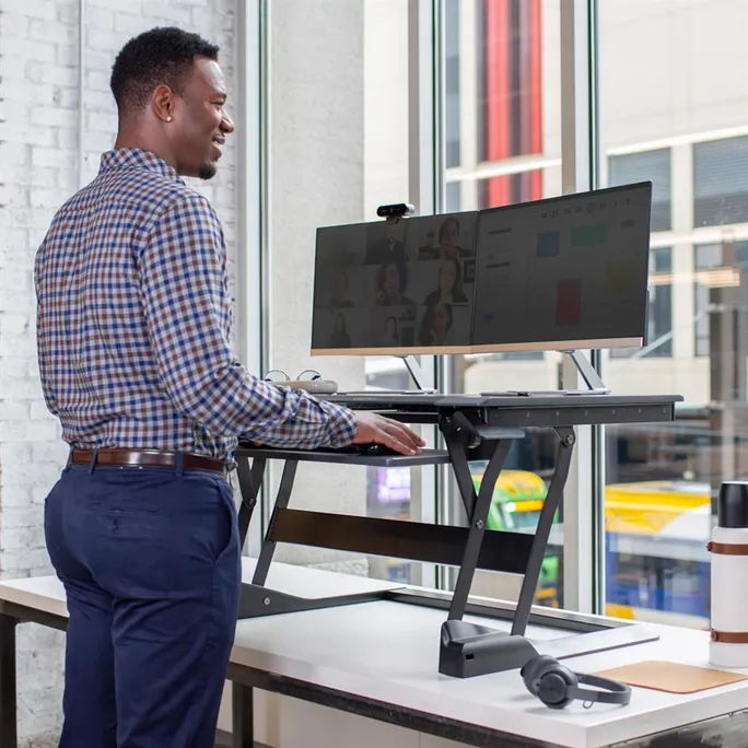 Wir stellen vor: eine äußerst einfach zu verwendende Stehschreibtischlösung, mit der eine Tischplatte schnell zu einem gesunden Sitz-Steh-Arbeitsplatz wird. Stellen Sie den WorkFit-TL einfach auf eine freie Oberfläche und Sie können mit der Arbeit beginnen.WorkFit-TL spart Platz, da das Produkt geradlinig nach oben und unten verschoben wird und die Stellfläche Ihres Schreibtisches nicht verändert. Die Plattform ist im gesamten Bewegungsbereich äußerst stabil. Sie können sich ungehindert dagegen lehnen während Sie arbeiten, ohne dass Sie sich Sorgen machen müssen, dass das Produkt umfällt oder die Höhe versehentlich verstellt wird.