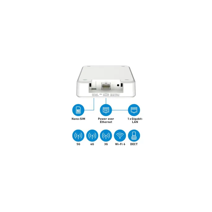 Die neue FRITZ!Box 6860 5G bringt das ultraschnelle 5G-Mobilfunk-Internet mit bis zu 1,3 GBit/s ins kabellose Heimnetz. Als Fixed-Wireless-Access-Lösung unterstützt sie sowohl 5G (NSA, SA) als auch LTE. Mit leistungsstarkem WLAN Mesh mit Wi-Fi 6 verteilt sie die Daten mit bis zu 3 GBit/s drahtlos im ganzen Haus. Dank des kompakten Designs und der Strom- und Datenversorgung über Power over Ethernet kann die vielseitige FRITZ!Box 6860 5G sowohl im Innen- als auch im Außenbereich genutzt werden. Eine DECT-Basisstation für Telefonie und Smart-Home-Anwendungen rundet das vielseitige Leistungsspektrum ab.