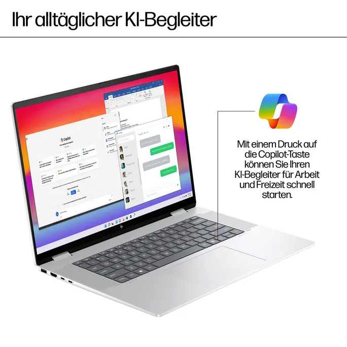 Entfesseln Sie Ihre Kreativität mit dem HP Envy x360 16 Zoll 2-in-1 Laptop, der Leistung, Vielseitigkeit und nachhaltiges Design vereint. Dank integrierter KI-Technologie, neuestem Intel® Prozessor und langer Akkulaufzeit meistert er mühelos alle Aufgaben des modernen Arbeitsalltags.Höchstleistung dank intelligenter TechnikDer HP Envy x360 16 überzeugt mit integrierter KI-Unterstützung, die für optimierte Verarbeitungsgeschwindigkeit und Akkulaufzeit sorgt. So können Sie gleichzeitig mehrere Programme nutzen, komplexe Designs erstellen und grafikintensive Anwendungen mühelos ausführen – alles ohne lästige Verzögerungen.Flexibel arbeiten und genießenMit seinem 360-Grad-Scharnier lässt sich der HP Envy x360 16 im Handumdrehen vom Laptop zum Tablet umfunktionieren. So können Sie bequem Notizen handschriftlich festhalten, Präsentationen erstellen oder Filme und Serien in bester Qualität genießen. Das 16 Zoll große Display mit 16:10-Seitenverhältnis bietet dabei viel Platz für Ihre Inhalte und sorgt für ein beeindruckendes Seherlebnis.Smarte Funktionen für den AlltagDer HP Envy x360 16 verfügt über zahlreiche smarte Funktionen, die Ihren Alltag erleichtern. Dazu gehören unter anderem: