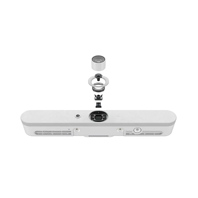- Integrierte Komponenten: 6 Beamforming-Mikrofone, PTZ-Kamera, 3 Lautsprecher, KI-Sucher, Kabelführungs- und -aufbewahrungssystem, Tischstativ, Logitech CollabOS-Plattform