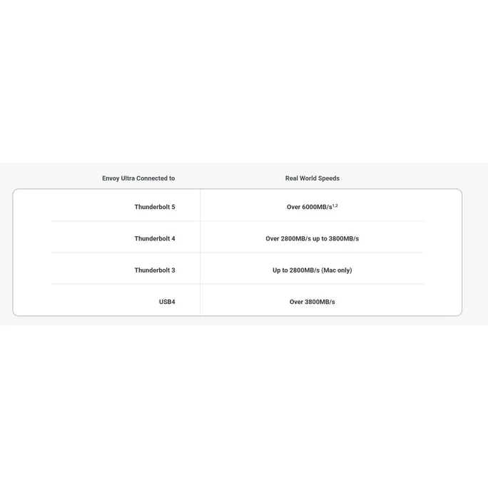 Envoy Ultra nutzt die fortschrittliche Thunderbolt 5-Technologie für eine doppelte Leistung, mit der Sie die interne Speichergeschwindigkeit Ihrer Maschine erreichen können. Sie beseitigen auch Engpässe, wenn Sie das Envoy Ultra an ein Thunderbolt 3-, Thunderbolt 4- oder USB4-Gerät anschließen. Schließen Sie einfach das integrierte Kabel des Envoy Ultra an, um maximale Leistung bei maximaler Kompatibilität zu genießen.