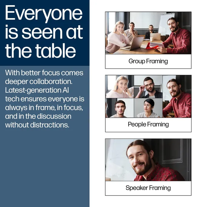 Je besser der Fokus, desto besser die Zusammenarbeit. KI-Technologie der neuesten Generation wie Poly DirectorAI setzt automatisch alle ins rechte Bild, rückt sie in den Fokus und bringt sie in den Mittelpunkt des Geschehens. Poly NoiseBlockAI und Acoustic Fence stellen gleichzeitig sicher, dass alle gehört werden und dass Störgeräusche außen vor bleiben.