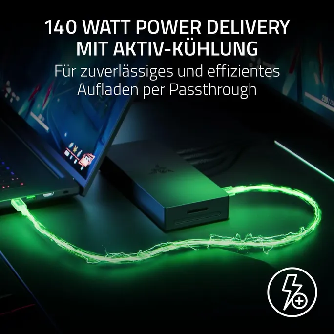 - 140 Watt Power Delivery mit Aktiv-Kühlung – Für zuverlässiges und effizientes Aufladen per Passthrough: Dank 56 Prozent höherer Ausgangsleistung als bei unserem Thunderbolt™ 4 Dock kannst du deinen Laptop schnell aufladen, ohne dass du extra ein Netzteil brauchst, und der integrierte Lüfter sorgt für eine zuverlässige Stromversorgung ohne Hitzestau.