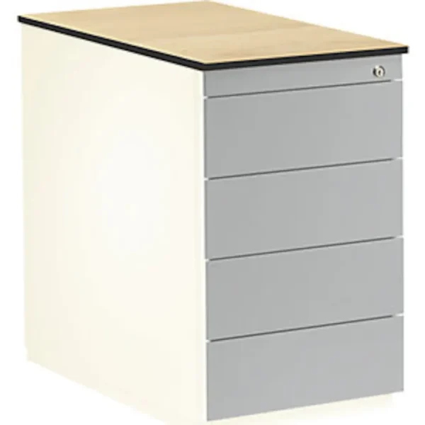 Schubladencontainer, HxT 708 x 800 mm, 4 Schubladen, reinweiß / weißaluminium / Ahorn. Anlieferung = montiert. Höhe = 708 mm. Breite = 417 mm. Tiefe = 800 mm. Utensilienschub = ja. Anzahl Materialschübe = 4 Stück. Auszug Materialschub = 75%. Innenmaße Materialschub HxBxT = 130x330x685 mm. Produkttyp = Standcontainer. Material = Stahl, pulverbeschichtet. Korpusfarbe = reinweiß RAL 9010. Korpusstärke = 0.75 mm. Schubladenmaterial = Stahlblech. Schubladenfarbe = weißaluminium RAL 9006. Schubladentraglast = 18 kg. Schubladen-Anzahl/Größe = 4 Stk HxBxT 130x330x685 mm. Schubladenführung = mit kugelgelagerten Teleskopauszügen. Eigenschaft = Auszugsperre, verschließbar. Plattenstärke = 13 mm. Schubladen mit Griffrinnen auf beiden Seiten und geschlossenem Boden. Hochwertige Führungen mit Selbsteinzug und Dämpfung. Auszugssperre und Drehzylinderschloss, verschiedenschließend. Stabiler, verschweißter Stahlblechkorpus mit hochwertiger Einbrennlackierung. Abdeckplatte HPL-Vollkern 13 mm, Kante schwarz. 4 Schubladen und 1 Utensilienschub auf kugelgelagerten Teleskopschienen, Teilauszug. Montierte Anlieferung. Gleichschließung auf Anfrage.