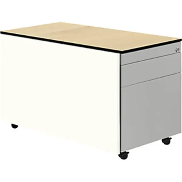 Schubladencontainer mit Rollen, HxT 523 x 800 mm, 1 Materialschub, 1 Hängeregistratur, reinweiß / weißaluminium / Ahorn. Anlieferung = montiert. Höhe = 523 mm. Breite = 417 mm. Tiefe = 800 mm. Utensilienschub = ja. Anzahl Hängeregistraturschübe = 1 Stück. Auszug Hängeregistratur = Vollauszug. Innenmaße Hängeregistratur HxBxT = 280x330x685 mm. Anzahl Materialschübe = 1 Stück. Auszug Materialschub = 75%. Innenmaße Materialschub HxBxT = 80x330x685 mm. Produkttyp = Rollcontainer. Material = Stahl, pulverbeschichtet. Korpusfarbe = reinweiß RAL 9010. Korpusstärke = 0.75 mm. Schubladenmaterial = Stahlblech. Schubladenfarbe = weißaluminium RAL 9006. Schubladentraglast = 18 kg. Schubladen-Anzahl/Größe = 1 Stk HxBxT 80x330x685 mm, 1 Stk HxBxT 280x330x685 mm. Schubladenführung = mit kugelgelagerten Teleskopauszügen. Eigenschaft = verschließbar, Auszugsperre. Radausstattung = 4 Rollen, davon 2 feststellbar. Raddurchmesser = 35 mm. Plattenstärke = 13 mm. Hochwertige Schubladenführung mit Selbsteinzug und Dämpfung. Alle Ausführungen mit Utensilienschub. Materialschübe 75%, Hängeregistraturen 100% ausziehbar. Schubladen mit Griffrinnen auf beiden Seiten und geschlossenem Boden. Hochwertige Führungen mit Selbsteinzug und Dämpfung. Auszugssperre und Drehzylinderschloss, verschiedenschließend. Stabiler, verschweißter Stahlblechkorpus mit hochwertiger Einbrennlackierung. Abdeckplatte HPL-Vollkern 13 mm, Kante schwarz. 1 Materialschub, 1 Hängeregistratur, kleine Schublade mit Teilauszug, große Schublade mit Vollauszug. Montierte Anlieferung.