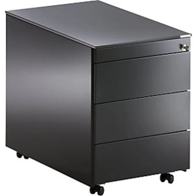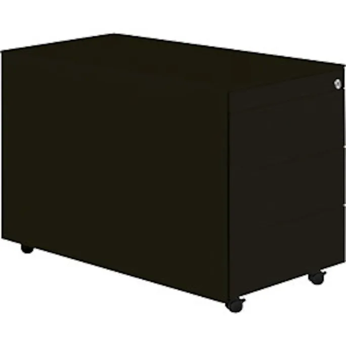 Schubladencontainer mit Rollen, HxT 570 x 800 mm, Stahlplatte, 3 Schubladen, graphitschwarz / graphitschwarz / graphitschwarz. Anlieferung = montiert. Höhe = 570 mm. Breite = 417 mm. Tiefe = 800 mm. Utensilienschub = ja. Anzahl Materialschübe = 3 Stück. Auszug Materialschub = 75%. Innenmaße Materialschub HxBxT = 130x330x685 mm. Produkttyp = Rollcontainer. Material = Stahl, pulverbeschichtet. Korpusfarbe = graphitschwarz RAL 9011. Korpusstärke = 0.75 mm. Schubladenmaterial = Stahlblech. Schubladenfarbe = graphitschwarz RAL 9011. Schubladentraglast = 18 kg. Schubladen-Anzahl/Größe = 3 Stk HxBxT 130x330x685 mm. Schubladenführung = mit kugelgelagerten Teleskopauszügen. Eigenschaft = verschließbar, Auszugsperre. Radausstattung = 4 Rollen, davon 2 feststellbar. Raddurchmesser = 35 mm. Plattenstärke = 10 mm. Hochwertige Schubladenführung mit Selbsteinzug und Dämpfung. Alle Ausführungen mit Utensilienschub. Materialschübe 75%, Hängeregistraturen 100% ausziehbar. Schubladen mit Griffrinnen auf beiden Seiten und geschlossenem Boden. Hochwertige Führungen mit Selbsteinzug und Dämpfung. Auszugssperre und Drehzylinderschloss, verschiedenschließend. Stabiler, verschweißter Stahlblechkorpus mit hochwertiger Einbrennlackierung. Rollcontainer mit Abdeckplatte aus Stahl. Materialschübe 80% ausziehbar. Montierte Anlieferung.