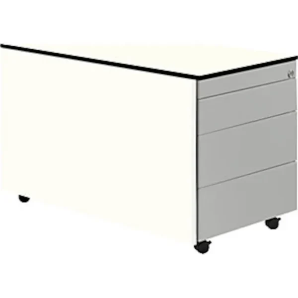 Schubladencontainer mit Rollen, HxT 523 x 800 mm, HPL-Vollkernplatte, 3 Schubladen, reinweiß / weißaluminium / weiß. Anlieferung = montiert. Höhe = 523 mm. Breite = 417 mm. Tiefe = 800 mm. Utensilienschub = ja. Anzahl Materialschübe = 3 Stück. Auszug Materialschub = 75%. Innenmaße Materialschub HxBxT = 1x 80x330x685, 2x 130x330x685 mm. Produkttyp = Rollcontainer. Material = Stahl, pulverbeschichtet. Korpusfarbe = reinweiß RAL 9010. Korpusstärke = 0.75 mm. Schubladenmaterial = Stahlblech. Schubladenfarbe = weißaluminium RAL 9006. Schubladentraglast = 18 kg. Schubladen-Anzahl/Größe = 1 Stk HxBxT 80x330x685 mm, 2 Stk HxBxT 130x330x685 mm. Schubladenführung = mit kugelgelagerten Teleskopauszügen. Eigenschaft = verschließbar, Auszugsperre. Radausstattung = 4 Rollen, davon 2 feststellbar. Raddurchmesser = 35 mm. Plattenstärke = 13 mm. Hochwertige Schubladenführung mit Selbsteinzug und Dämpfung. Alle Ausführungen mit Utensilienschub. Materialschübe 75%, Hängeregistraturen 100% ausziehbar. Schubladen mit Griffrinnen auf beiden Seiten und geschlossenem Boden. Hochwertige Führungen mit Selbsteinzug und Dämpfung. Auszugssperre und Drehzylinderschloss, verschiedenschließend. Stabiler, verschweißter Stahlblechkorpus mit hochwertiger Einbrennlackierung. Abdeckplatte HPL-Vollkern 13 mm, Kante schwarz. 3 Schubladen auf kugelgelagerten Teleskopschienen, Teilauszug. Montierte Anlieferung.