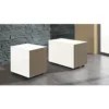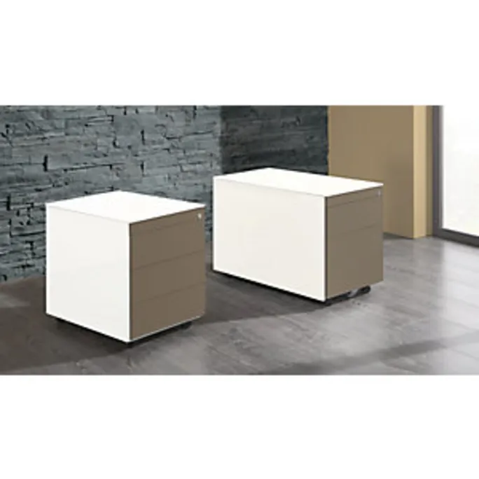 Schubladencontainer mit Rollen, HxT 570 x 800 mm, 1 Materialschub, 1 Hängeregistratur, reinweiß / beigegrau / reinweiß. Anlieferung = montiert. Höhe = 570 mm. Breite = 417 mm. Tiefe = 800 mm. Utensilienschub = ja. Anzahl Hängeregistraturschübe = 1 Stück. Auszug Hängeregistratur = 100%. Innenmaße Hängeregistratur HxBxT = 280x330x685 mm. Anzahl Materialschübe = 1 Stück. Auszug Materialschub = 75%. Innenmaße Materialschub HxBxT = 130x330x685 mm. Produkttyp = Rollcontainer. Material = Stahl, pulverbeschichtet. Korpusfarbe = reinweiß RAL 9010. Korpusstärke = 0.75 mm. Schubladenmaterial = Stahlblech. Schubladenfarbe = beigegrau RAL 7006. Schubladentraglast = 18 kg. Schubladen-Anzahl/Größe = 1 Stk HxBxT 130x330x685 mm, 1 Stk HxBxT 280x330x685 mm. Schubladenführung = mit kugelgelagerten Teleskopauszügen. Eigenschaft = verschließbar, Auszugsperre. Radausstattung = 4 Rollen, davon 2 feststellbar. Raddurchmesser = 35 mm. Plattenstärke = 10 mm. Hochwertige Schubladenführung mit Selbsteinzug und Dämpfung. Alle Ausführungen mit Utensilienschub. Materialschübe 75%, Hängeregistraturen 100% ausziehbar. Schubladen mit Griffrinnen auf beiden Seiten und geschlossenem Boden. Hochwertige Führungen mit Selbsteinzug und Dämpfung. Auszugssperre und Drehzylinderschloss, verschiedenschließend. Stabiler, verschweißter Stahlblechkorpus mit hochwertiger Einbrennlackierung. Rollcontainer mit Abdeckplatte aus Stahl. Materialschübe 80%, Hängeregistraturen 100% ausziehbar. Montierte Anlieferung.