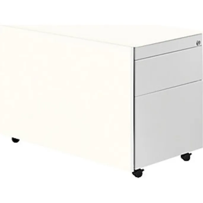 Schubladencontainer mit Rollen, HxT 570 x 800 mm, 1 Materialschub, 1 Hängeregistratur, reinweiß / weißaluminium / weiß. Anlieferung = montiert. Höhe = 570 mm. Breite = 417 mm. Tiefe = 800 mm. Utensilienschub = ja. Anzahl Hängeregistraturschübe = 1 Stück. Auszug Hängeregistratur = 100%. Innenmaße Hängeregistratur HxBxT = 280x330x685 mm. Anzahl Materialschübe = 1 Stück. Auszug Materialschub = 75%. Innenmaße Materialschub HxBxT = 130x330x685 mm. Produkttyp = Rollcontainer. Material = Stahl, pulverbeschichtet. Korpusfarbe = reinweiß RAL 9010. Korpusstärke = 0.75 mm. Schubladenmaterial = Stahlblech. Schubladenfarbe = weißaluminium RAL 9006. Schubladentraglast = 18 kg. Schubladen-Anzahl/Größe = 1 Stk HxBxT 130x330x685 mm, 1 Stk HxBxT 280x330x685 mm. Schubladenführung = mit kugelgelagerten Teleskopauszügen. Eigenschaft = verschließbar, Auszugsperre. Radausstattung = 4 Rollen, davon 2 feststellbar. Raddurchmesser = 35 mm. Plattenstärke = 10 mm. Hochwertige Schubladenführung mit Selbsteinzug und Dämpfung. Alle Ausführungen mit Utensilienschub. Materialschübe 75%, Hängeregistraturen 100% ausziehbar. Schubladen mit Griffrinnen auf beiden Seiten und geschlossenem Boden. Hochwertige Führungen mit Selbsteinzug und Dämpfung. Auszugssperre und Drehzylinderschloss, verschiedenschließend. Stabiler, verschweißter Stahlblechkorpus mit hochwertiger Einbrennlackierung. Rollcontainer mit Abdeckplatte aus Stahl. Materialschübe 80%, Hängeregistraturen 100% ausziehbar. Montierte Anlieferung.