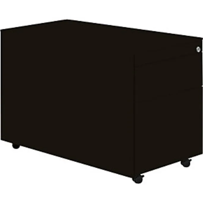 Schubladencontainer mit Rollen, HxT 570 x 800 mm, 1 Materialschub, 1 Hängeregistratur, graphitschwarz / graphitschwarz / graphitschwarz. Anlieferung = montiert. Höhe = 570 mm. Breite = 417 mm. Tiefe = 800 mm. Utensilienschub = ja. Anzahl Hängeregistraturschübe = 1 Stück. Auszug Hängeregistratur = 100%. Innenmaße Hängeregistratur HxBxT = 280x330x685 mm. Anzahl Materialschübe = 1 Stück. Auszug Materialschub = 75%. Innenmaße Materialschub HxBxT = 130x330x685 mm. Produkttyp = Rollcontainer. Material = Stahl, pulverbeschichtet. Korpusfarbe = graphitschwarz RAL 9011. Korpusstärke = 0.75 mm. Schubladenmaterial = Stahlblech. Schubladenfarbe = graphitschwarz RAL 9011. Schubladentraglast = 18 kg. Schubladen-Anzahl/Größe = 1 Stk HxBxT 130x330x685 mm, 1 Stk HxBxT 280x330x685 mm. Schubladenführung = mit kugelgelagerten Teleskopauszügen. Eigenschaft = verschließbar, Auszugsperre. Radausstattung = 4 Rollen, davon 2 feststellbar. Raddurchmesser = 35 mm. Plattenstärke = 10 mm. Hochwertige Schubladenführung mit Selbsteinzug und Dämpfung. Alle Ausführungen mit Utensilienschub. Materialschübe 75%, Hängeregistraturen 100% ausziehbar. Schubladen mit Griffrinnen auf beiden Seiten und geschlossenem Boden. Hochwertige Führungen mit Selbsteinzug und Dämpfung. Auszugssperre und Drehzylinderschloss, verschiedenschließend. Stabiler, verschweißter Stahlblechkorpus mit hochwertiger Einbrennlackierung. Rollcontainer mit Abdeckplatte aus Stahl. Materialschübe 80%, Hängeregistraturen 100% ausziehbar. Montierte Anlieferung.