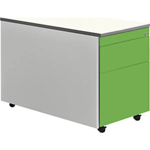 Schubladencontainer mit Rollen, HxT 579 x 800 mm, Kunststoffplatte, 1 Materialschub, 1 Hängeregistratur, weißaluminium / gelbgrün / weiß. Anlieferung = montiert. Höhe = 579 mm. Breite = 417 mm. Tiefe = 800 mm. Utensilienschub = ja. Anzahl Hängeregistraturschübe = 1 Stück. Auszug Hängeregistratur = Vollauszug. Innenmaße Hängeregistratur HxBxT = 280x330x685 mm. Anzahl Materialschübe = 1 Stück. Auszug Materialschub = 75%. Innenmaße Materialschub HxBxT = 130x330x685 mm. Produkttyp = Rollcontainer. Material = Stahl, pulverbeschichtet. Korpusfarbe = weißaluminium RAL 9006. Korpusstärke = 0.75 mm. Schubladenmaterial = Stahlblech. Schubladenfarbe = gelbgrün RAL 6018. Schubladentraglast = 18 kg. Schubladen-Anzahl/Größe = 1 Stk HxBxT 130x330x685 mm, 1 Stk HxBxT 280x330x685 mm. Schubladenführung = mit kugelgelagerten Teleskopauszügen. Eigenschaft = verschließbar, Auszugsperre. Radausstattung = 4 Rollen, davon 2 feststellbar. Raddurchmesser = 35 mm. Plattenstärke = 19 mm. Hochwertige Schubladenführung mit Selbsteinzug und Dämpfung. Alle Ausführungen mit Utensilienschub. Materialschübe 75%, Hängeregistraturen 100% ausziehbar. Schubladen mit Griffrinnen auf beiden Seiten und geschlossenem Boden. Hochwertige Führungen mit Selbsteinzug und Dämpfung. Auszugssperre und Drehzylinderschloss, verschiedenschließend. Stabiler, verschweißter Stahlblechkorpus mit hochwertiger Einbrennlackierung. Abdeckplatte melaminharzbeschichtet 19 mm mit ABS-Umleimer. 1 Materialschub, 1 Hängeregistratur, kleine Schublade mit Teilauszug, große Schublade mit Vollauszug. Montierte Anlieferung.