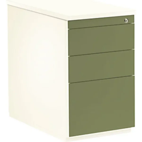 Schubladencontainer, HxT 720 x 800 mm, 2 Materialschübe, 1 Hängeregistratur, reinweiß / schilfgrün / reinweiß. Anlieferung = montiert. Höhe = 720 mm. Breite = 417 mm. Tiefe = 800 mm. Utensilienschub = ja. Anzahl Hängeregistraturschübe = 1 Stück. Auszug Hängeregistratur = 100%. Innenmaße Hängeregistratur HxBxT = 280x330x685 mm. Anzahl Materialschübe = 2 Stück. Auszug Materialschub = 75%. Innenmaße Materialschub HxBxT = 130x330x685 mm. Produkttyp = Standcontainer. Material = Stahl, pulverbeschichtet. Korpusfarbe = reinweiß RAL 9010. Korpusstärke = 0.75 mm. Schubladenmaterial = Stahlblech. Schubladenfarbe = schilfgrün RAL 6013. Schubladentraglast = 18 kg. Schubladen-Anzahl/Größe = 2 Stk HxBxT 130x330x685 mm, 1 Stk HxBxT 280x330x685 mm. Schubladenführung = mit kugelgelagerten Teleskopauszügen. Eigenschaft = Auszugsperre, verschließbar. Plattenstärke = 25 mm. Schubladen mit Griffrinnen auf beiden Seiten und geschlossenem Boden. Hochwertige Führungen mit Selbsteinzug und Dämpfung. Auszugssperre und Drehzylinderschloss, verschiedenschließend. Stabiler, verschweißter Stahlblechkorpus mit hochwertiger Einbrennlackierung. Standcontainer mit Abdeckplatte aus Kunststoff, melaminharzbeschichtet. 2 Materialschübe, 1 Hängeregistratur, 1 Utensilienschub. Materialschübe 75%, Hängeregistraturen 100% ausziehbar. Montierte Anlieferung. Gleichschließung auf Anfrage.