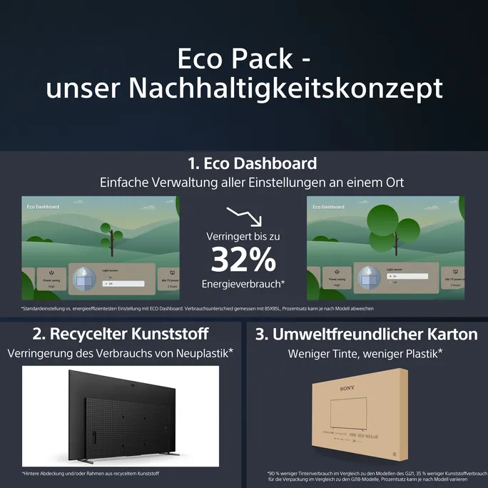 Der von Sony entwickelte Recycling-Kunststoff SORPLAS™ wird in unseren Fernsehern verwendet, um den Anteil neuer Kunststoffe um ca. 60 zu senken und die elegante, glänzend schwarze Oberfläche zu erhalten, die für BRAVIA™ typisch ist. Darüber hinaus wurde in unseren neuen Verpackungen das Kunststoffvolumen um rund 35 reduziert.