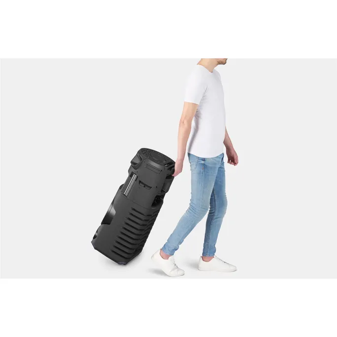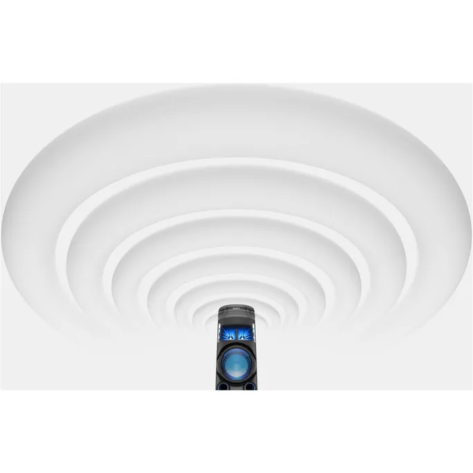 Der leistungsstarke Mitteltonbereich mit Hornmitteltönern an der Vorder- und Rückseite verteilt den Klang klarer mit einem für Mitteltonfrequenzen optimierten Schalldruck. Ob Sie also vor oder hinter dem Gerät stehen, in der Nähe oder weiter weg: Gesang wird immer klar wiedergegeben, damit das Tanzen und Mitsingen Spaß macht.